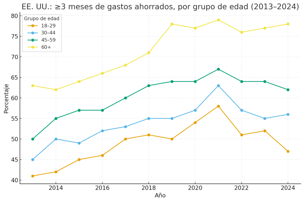 A primera vista, la imagen se ve un poco mejor. Un poco más de la mitad de los adultos en EE. UU. informan tener ≥3 meses ahorrados. Durante la última década, esta proporción ha aumentado (nuevamente, con un pico en la era de la pandemia y luego un regreso a los niveles de los años 50). Cuando lo divides por edad, el patrón se mantiene, pero también ves que los jóvenes tienen menos probabilidades de tener ese colchón que los adultos mayores, lo cual es esperado e incluso razonable dado la etapa de la vida (los hogares mayores están cerca o en la jubilación).